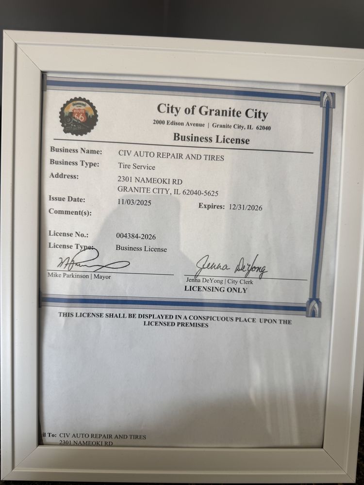 CIV Auto Repair End Tires is your Granite City stop for automotive service. We handle general maintenance like oil changes and brake repair, in addition to complex engine diagnostics. Our shop also provides a full range of tire services, including new tire sales and balancing. We are committed to getting your vehicle back on the road! Text me!